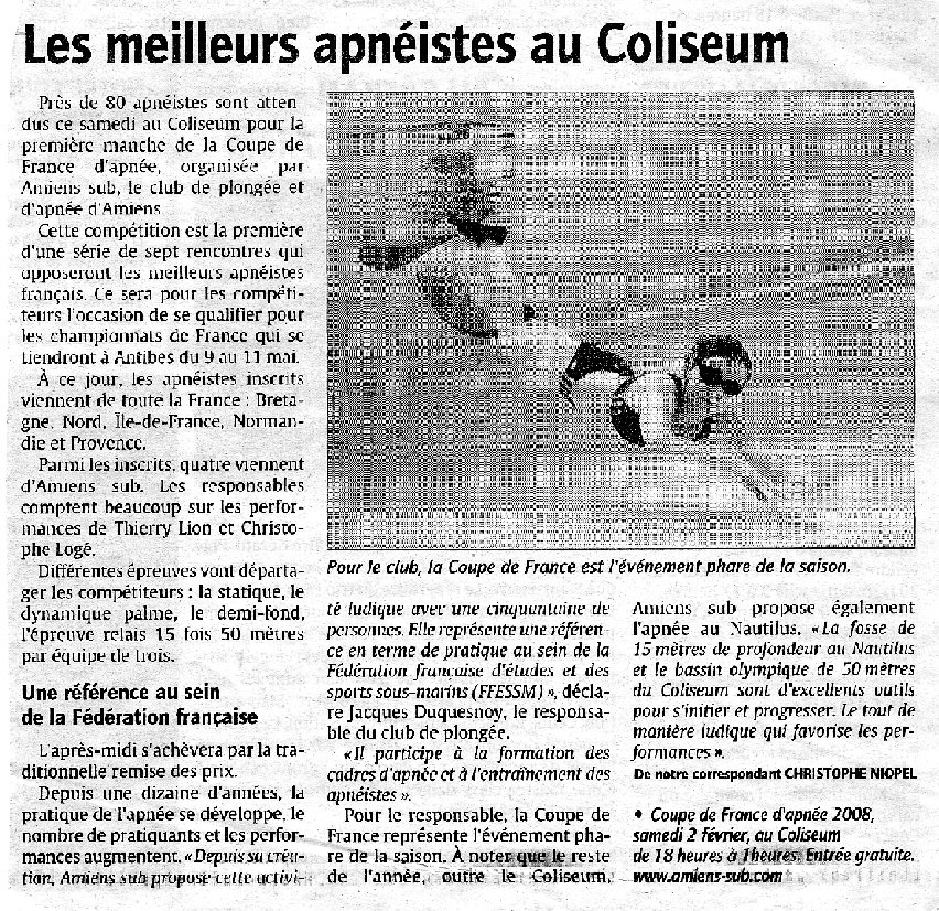 Avant la compétition nationale d'apnée de ce Samedi (2 février 2008), Le courrier Picard avait mis